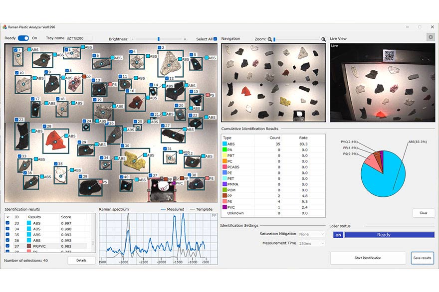 新製品は、ラマン分光法を用いた独自開発のレーザースキャン方式により、黒色を含めた複数のプラスチック片の材質を簡易かつ高精度に一括判別できる装置です。さまざまなプラスチック片の中から、特定のプラスチックの材質やその割合を迅速に調べられるため、リサイクル業の幅広い現場における品質チェック・分析工程の大幅な効率化が可能です。分析結果をフィードバックすることで、回収・選別条件の最適化を行うなど、さらなる高純度化に向けた活用も見込め、マテリアルリサイクルの最大化に貢献します。