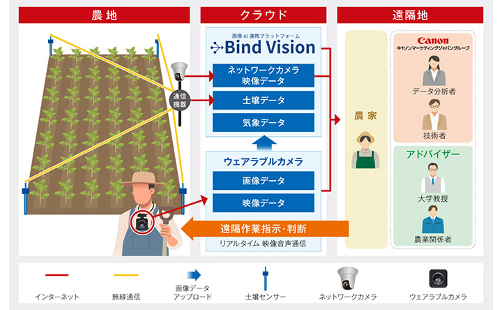愛媛県内の2か所の農家で、バラ・里芋の露地栽培、トマトのハウス栽培を対象に、映像・気象・土壌データをキヤノンITSの画像AI連携プラットフォーム「Bind Vision(バインドビジョン)」で可視化・蓄積します。高画質な映像や画像により、遠隔地からでも農地や農作物の状況をリアルタイムで把握し、気象・土壌データなどの環境データの推移と組み合わせることで、育成状況に関するデータの振り返りを可能にします。また、ウェアラブルカメラを活用し、現場の映像や音声を共有しコミュニケーションを取ることで、遠隔地からの状況判断や作業指示を支援します。これにより生産業務の効率化に加え、データの可視化を通じた技術継承や作業の平準化を支援し、農作物の品質向上と収量増加の促進を実証します。