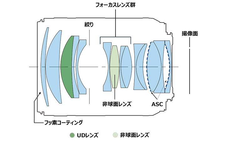 UD(Ultra low Dispersion=特殊低分散)ガラスを用いたレンズ。