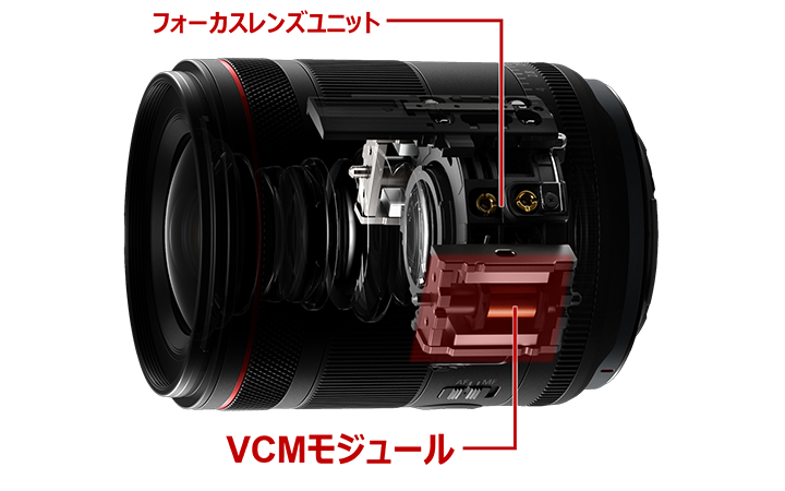 磁石のエネルギー(磁場)を媒体として、電気エネルギーを運動エネルギーに変換するアクチュエーター。駆動用マグネットが作る磁場の中をコイルが前後に動き、コイルが固定されたフォーカスレンズユニットをリニア駆動します。
