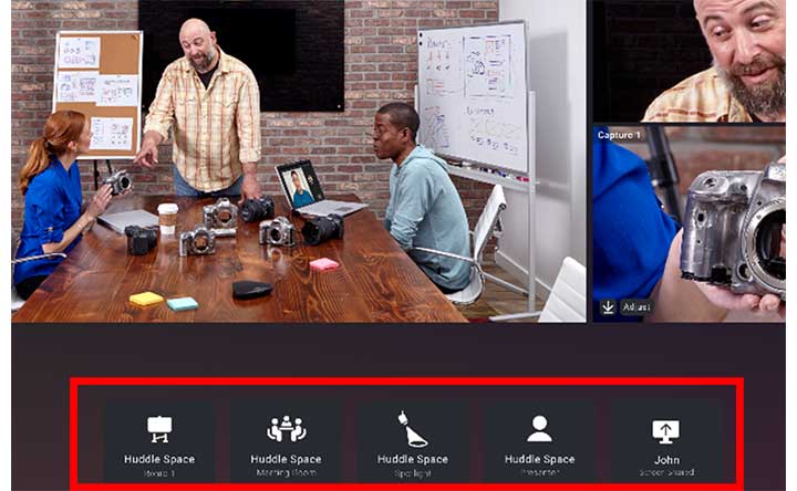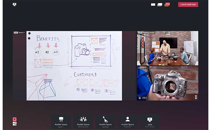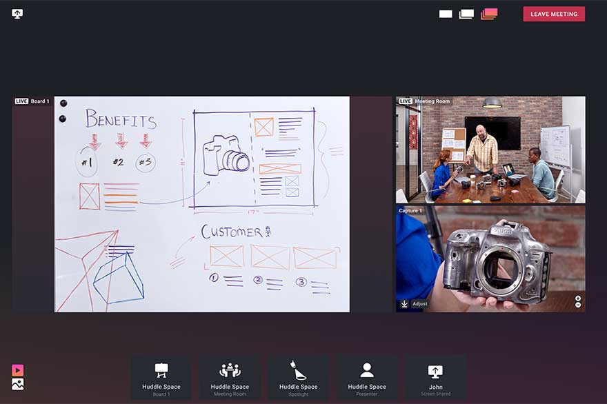 “AMLOS(Activate My Line of Sight)”は、キヤノンUSA(Canon U.S.A., Inc. 住所:アメリカ ニューヨーク州メルヴィル 社長:小林伊三夫)が開発した、職場や教室などに設置されたカメラ1台で会議・講義の参加者に複数の視点を提供できるリモート会議ソリューション です。会議・講義で共有されるさまざまなソース(映像・資料・画像)を視聴者側が任意に選択・視聴でき、一方的な映像配信と比べてより有機的で柔軟な会議・講義を実現します。