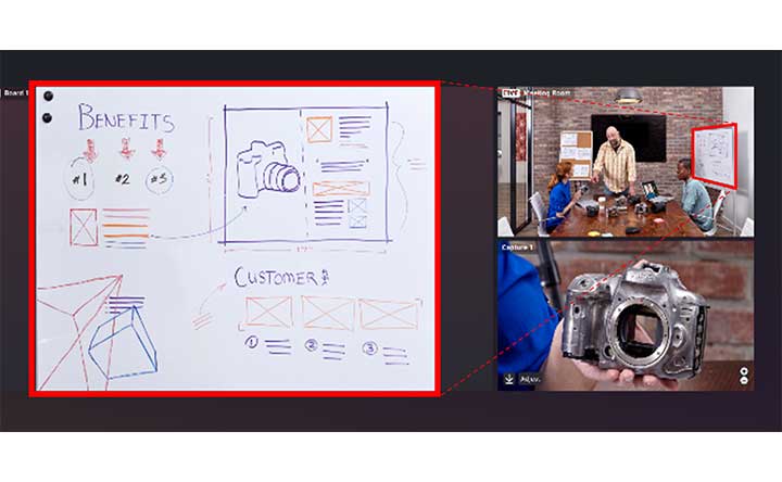 1台のキヤノン製リモートカメラ※2映像から複数の画面を生成したり、映像の歪み補正や透過処理をしたりする機能です。会議全体の画に加えて、任意の箇所(ホワイトボード・黒板・コルクボード等の特定領域)を切り出した映像 を部屋に設置されたキヤノンリモートカメラ映像 から生成します。ホワイトボード・黒板・コルクボードの切り出し時は歪みを補正した正対表示が可能で、さらに反射や人間の映り込みなどの透過処理により視聴者はボードに描かれたイラストや文字を鮮明に確認できます。
