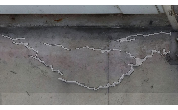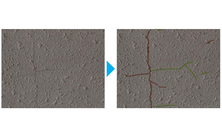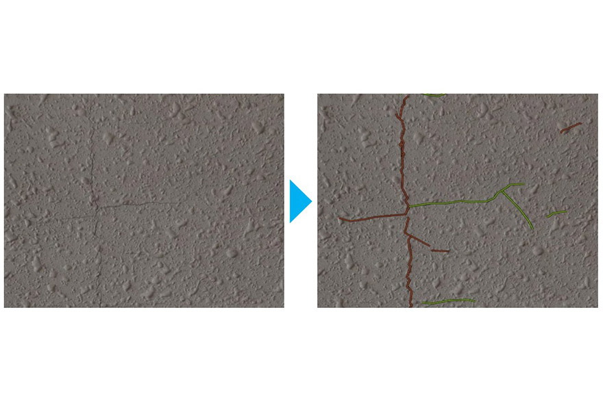 また、2025年5月に大田区および東京科学大学との連携で公益社団法人 土木学会の「デジタルツイン・DXシンポジウム2025」にて発表し「デジタルツイン・DX特別賞」を受賞した、「鋼材の塗膜剥がれ・腐食検知」を搭載し、横断歩道橋や水管橋※など鋼材構造物の点検も対応可能となりました。さらに、ドローン点検を行う事業者からの強い要望に応え、「建物外壁のひび割れ検知」を新たに搭載しました。