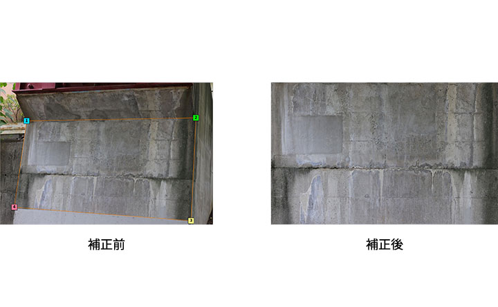 これらにより、検知可能な変状が従来の5種類から12種類に拡大し、点検対象の幅が大きく広がりました。さらに、構造物を斜めから撮影した画像のゆがみを補正し、正面視点に変換する「正対補正」機能や、画像内の検知不要エリアを指定できる「非検知エリア設定」機能など、現場のニーズに即した実用的な機能を追加しました。
