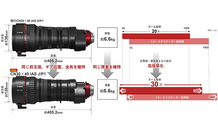 広角端40mmから世界最望遠となる望遠端1200mmまでの幅広い焦点距離をカバーする30倍ズームレンズです。内蔵1.5倍エクステンダー使用時は、ズーム域を焦点距離60mm-1800mmに切り替えられるほか、35mmフルサイズセンサーに対応するレンズとして使用可能です。また、20倍から30倍へと大きく高倍率化しながらも、“CN30×40 IAS J/P1”は従来機種と同等の全長約405.2mm、質量約6.6kgを維持※3しています。