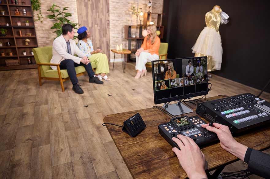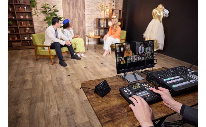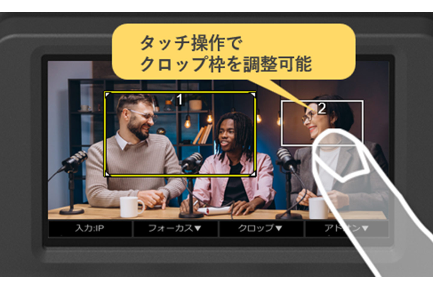 IPで入力された映像を表示できる3.5インチのタッチパネルを搭載し、1台のコントローラーに最大9台の映像を同時に表示することが可能です。また人物の顔などをタッチするだけでAF対象を指定できるほか、3つのクロップ枠を同時に表示し、映像を見ながらそれぞれのクロップ枠の位置やサイズを調整できます※4。
