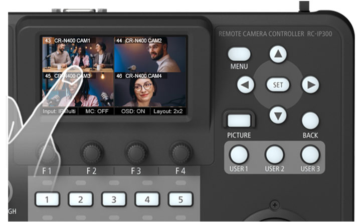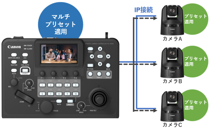 PCを使用せずに“RC-IP300”で簡単にリモートカメラの初期設定を行うことができます。また、各カメラに設定したプリセット番号を組み合わせて実行できるマルチプリセット機能により、一斉に複数台のカメラをあらかじめ決めた画角に動かすことが可能です。さらに、「アドオンアプリケーションズシステム」との連携が可能で、「自動追尾アプリケーション」と「自動ループアプリケーション」(ともに2023年4月発売)に対応しています。