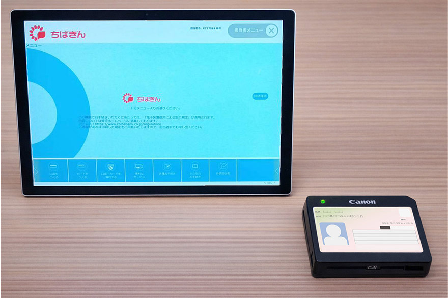 このたび、キヤノンMJは本ソリューションを千葉銀行の店頭タブレット「TSUBASA Smile」に導入しました。本ソリューションは、金融機関の店頭における本人確認業務のプロセスを最適化するサービスです。マイナンバーカードや運転免許証などの本人確認書類のICチップ情報を読み取ることで、書類の真正性をシステム上で確認します。その上で、キヤノン独自の高精度な顔認証技術により、ICチップ内に格納された顔画像と来店顧客の容貌を照合し、本人であることを高い精度で判定します。加えて、OCR※1機能により、タブレットのカメラで本人確認書類の券面に記載された情報を読み取り、取得した情報を業務へ自動反映することが可能となります。本ソリューションは、顧客の手続き負担を軽減するだけでなく、行員による手入力作業の削減や入力ミスの防止に貢献します。また、本人確認結果を勘定系システムへ連携することで、本人確認後の後続業務を含めた業務プロセス全体の自動化を実現し、金融機関の業務効率化、サービス品質の向上を支援します。