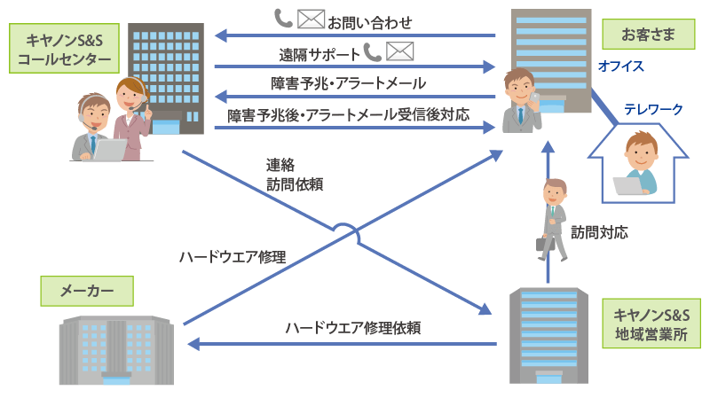 さらに、テレワーク環境が進んでいくことで、IT管理者の方に従業員から多様な質問が寄せられ、対処し切れなくなるケースも生じてきます。そこでキヤノンS&Sは、お客さまの拠点はもちろん、IT管理者の代わりに従業員のテレワーク先にリモートアクセスしてトラブルを解決するといったサービスも提供しています。