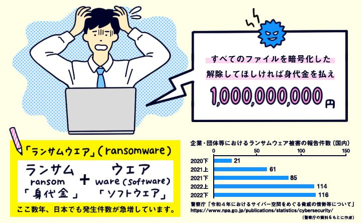 近年、「ランサムウェアによる攻撃で工場の稼働がストップ!」なんてニュースを耳にする機会が多くなっています。「ランサムウェア」(ransomware)は、マルウェア(悪意あるプログラム)の一種で、これにパソコンやスマートフォンが感染すると、システムがロックされたり、保存しているデータが暗号化されたりして、使用できなくなってしまいます。
