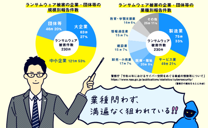 被害に遭うのは大きな企業や組織ばかりではありません。攻撃のターゲットは中小規模の企業であるケースも多く、実は発生件数全体の半数以上は中小企業です。
