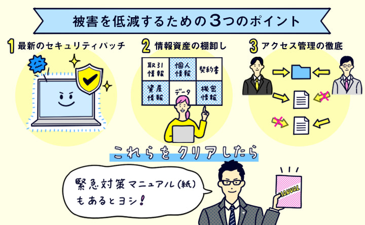 以上の3つを優先的に行い、余力があれば、サイバー攻撃を受けた際の「緊急対策マニュアル」を作成することをおすすめします。マニュアルは、攻撃者によりシステムがロックされたり、データが暗号化されたりした状況下で使用する場合も想定し、紙でも保管するようにしておくと安心です。
