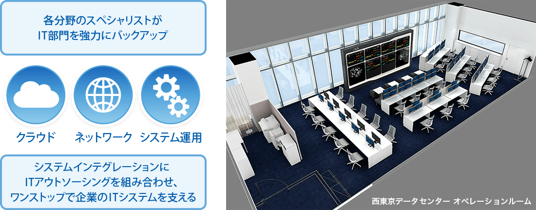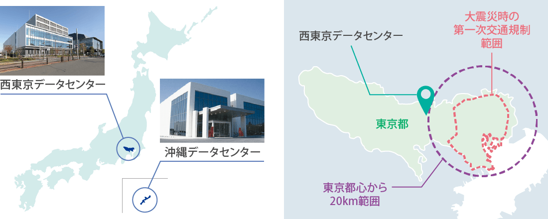 データセンター事業の中核となるのが「西東京データセンター」と「沖縄データセンター」の2拠点。都心から20km圏内の都市近郊型データセンターの「西東京データセンター」と、首都圏から約1,600km離れ、DRに最適な「沖縄データセンター」との連携により、あらゆる災害対策を想定した万全なBCPの実現を目指している。