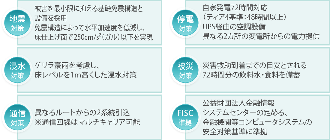 西東京データセンターを利用するお客さまの重要なIT資産を守るため、国内最高クラスの耐震性能や柔軟性を考慮した引込回線など、データセンターファシリティスタンダードで最高ランクのティア4レベルの高性能ファシリティで、地震、停電、浸水、被災、通信障害などあらゆる事態に備えている。