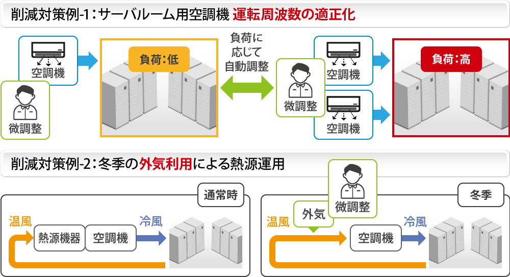 西東京データセンターでは電力消費量の削減に向けた取り組みも継続している。例えばサーバルーム用の空調は、サーバの負荷に応じて稼働する空調機を自動調整する。また、冬季には冷たい外気を利用することで空調機の負荷を減らす。いずれも有人による微調整も行っている。
