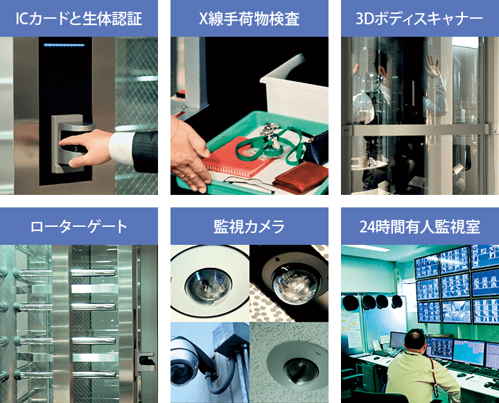 ICカードと生体認証による本人確認、X線手荷物検査、3Dボディスキャナー、ローターゲート、監視カメラ、24時間有人監視室など、万全のセキュリティでお客さまが安心して利用できる環境を提供している。