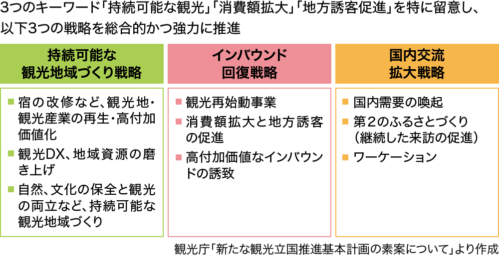 2006年に制定された「観光立国推進基本法」の規定に基づき、観光立国の実現に関する施策の総合的かつ計画的な推進を図るため、2023年3月に新たな「観光立国推進基本計画」が閣議決定された。本計画では「持続可能な観光」「消費額拡大」「地方誘客促進」という3つのキーワードが基本的な方針として掲げられ、観光庁もそれに沿った今後の観光政策の方向性を示している。