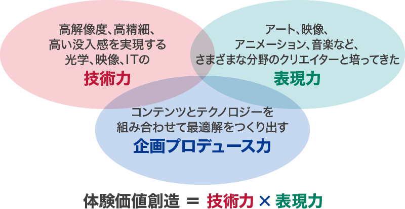 地域や場所、施設における体験価値の向上など、技術力だけでは解決できない社会課題が増えている。キヤノンMJは、キヤノンの多彩なプロダクトや先駆的映像技術などの「技術力」と、さまざまなジャンルのクリエイターへのサポートを通じて培ってきた「表現力」を、キヤノンMJグループの「企画プロデュース力」によって掛け合わせた「体験価値創造ソリューション」で課題解決に貢献する。