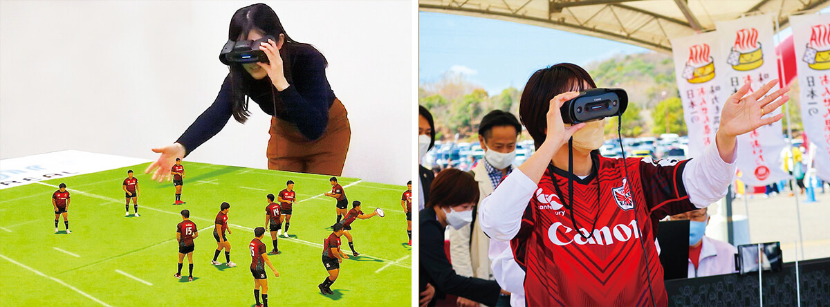 横浜キヤノンイーグルスが第2拠点とするレゾナックドーム大分(旧・昭和電工ドーム大分)での試合開催時に実施された、先端技術を活用した「デジタルラグビー体験会」。ラグビーのプレーを選手の目の前にいる感覚で見たり(VR)、画面内の選手たちの中に入って記念撮影したり(AR)、ミニチュアグラウンドでプレーする選手を好きな角度から見たり(MR)する体験イベントが開催された。