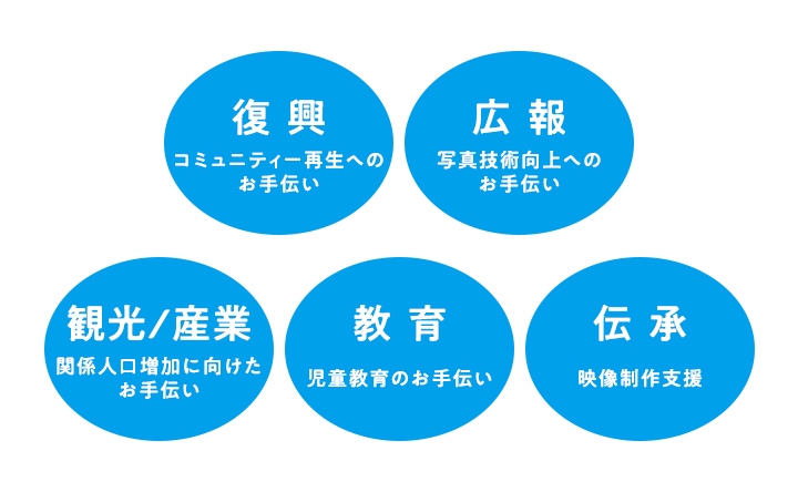 その結果、私たちの存在意義や提供価値は、地域の「復興」「広報」「観光/産業」「教育」「伝承」の5つの領域に及ぶと考えました。