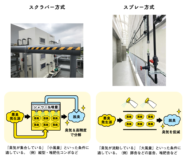 どちらをご提案するかは、臭気の強さ、お客さまの設備の空気の流れなど、さまざまな条件によって変わりますが、臭気が強かったり、臭気を外部に出せない厳しい条件があったりするところではスクラバー方式をご提案することが多くなっています。