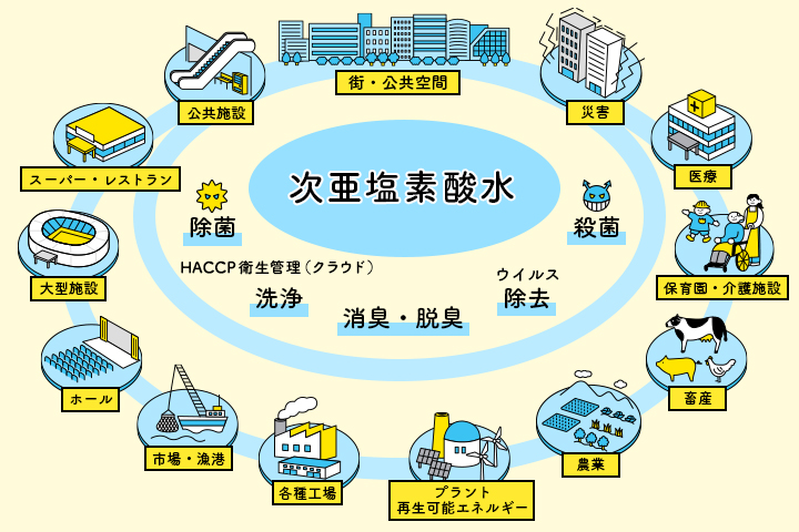 例えば、食品業界では安心安全な食を届けるため、食材や厨房機器の除菌・洗浄が必要とされますし、畜産業においては牛、豚、鶏など家畜の疾病を防ぐため、施設などの除菌・洗浄が求められています。