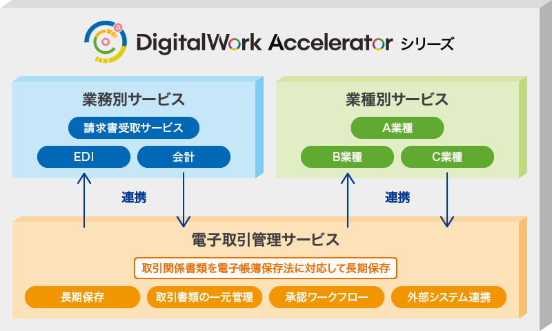 お客さまの業務プロセス変革と経営資源である業務データの利活用を促進する、クラウド型のデジタルドキュメントサービス。2022年12月に提供を開始した「電子取引管理サービス」に加え、郵送やメールで受け取っていた請求書をオンラインで受け取ることにより、インボイス制度と電帳法に準拠し、業務の効率化を実現する「請求書受取サービス」の提供を23年5月に開始した。今後、業務別サービスや業種別サービスとの連携を強化し、業務プロセス変革の支援と新たな価値を創出するプラットフォームとしてサービスを拡充していく。