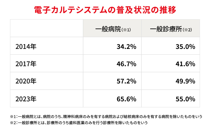 ただ、2023年の厚生労働省の医療施設調査によると、一般診療所への電子カルテ導入率は55%。一口に電子カルテといっても、医療機関や医師ごとに運用状況や求めるものが異なるため、なかなか一筋縄ではいかないようだ。