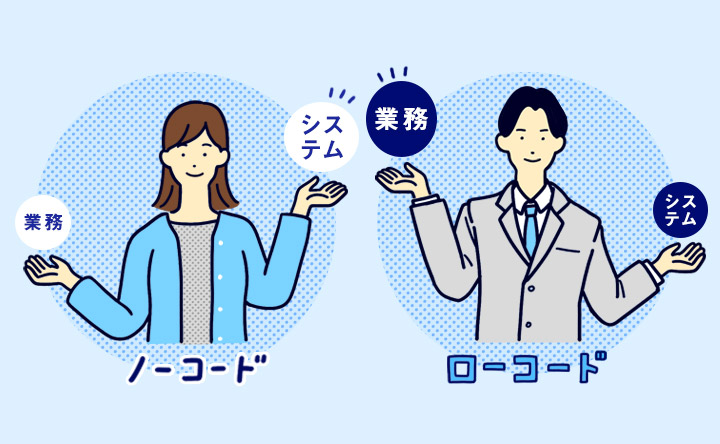 一方、ローコード開発の場合、ある程度のプログラミングスキルが必要になります。ただし、ツール側に用意されているコードに加えて、自分たちで書いたコードも組み合わせてプログラムを組み上げられる柔軟性があるため、業務に寄り添った開発ができます。現場部門との共創によって使い勝手の良いシステムをつくりたいというケースにはぴったりです。