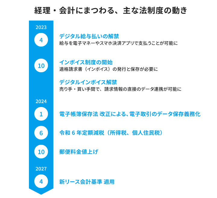 近年ですと、2023年10月に開始されたインボイス制度や、2024年1月の電子帳簿保存法改正による電子取引のデータ保存義務化などは、経理・会計業務に携わる方々にとってはもちろん、社会的にも非常に影響が大きいものでしたから、多くの方々の印象に残っていると思います。