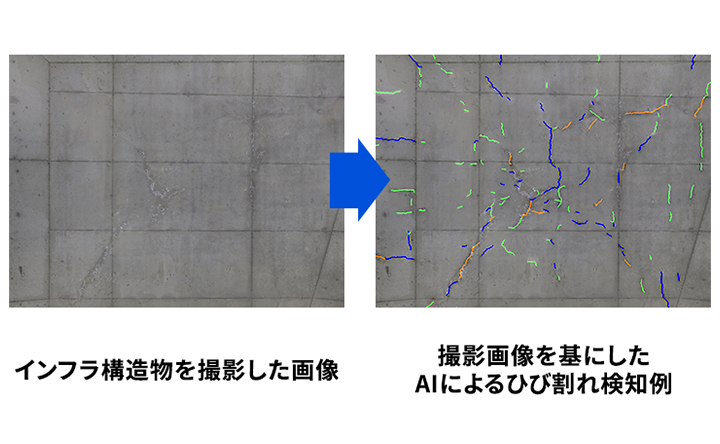 当サービスは、いわゆる「変状検知」といって、現場でお客さまが撮影したコンクリートの状態の画像を基に、AIを活用してひび割れなどの損傷(変状)を自動検知するものです。