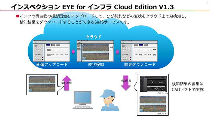 森川:つまり、既存サービスのクラウド版ですね。お客さまご自身が撮影した画像をアップロードすることで、クラウド上でAIによる変状検知を行い、そのデータを基に点検調書の作成までできるサービスです。