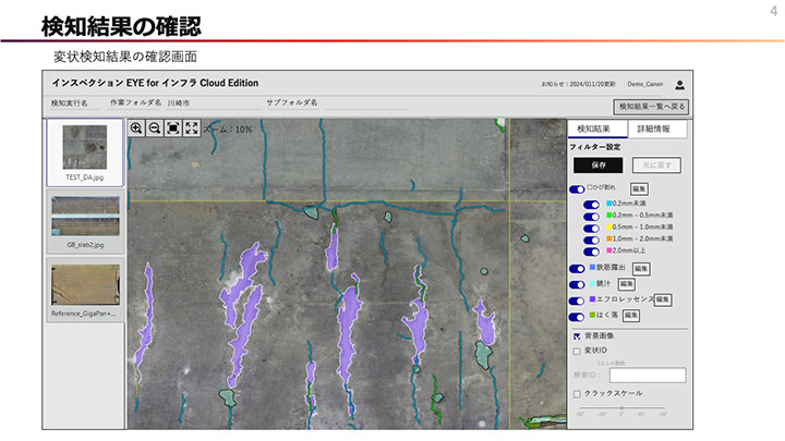 「インスペクション EYE for インフラ Cloud Edition」の変状検知結果の確認画面。ひび割れの幅のサイズごとに、色分けされている