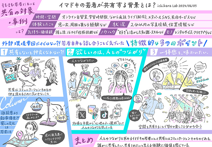 共有の内容や程度は人それぞれですが、現代の若者にとって共有とはコミュニケーションそのものであることが分かりました。だからこそ仲良くなるためには欠かせないことであり、人とのつながりや視野を広げるきっかけにもなっています。コロナ禍を学生のときに経験し、青春時代に仲間と苦楽を共にできない困難に直面した世代だからこそ、一体感を求めるのかもしれません。また多様性が浸透したことにより自分らしさが必要になる機会も多い若者にとって、好きなことや経験を共有することは周囲に角を立てずに間接的にアイデンティティを表明できる手段の一つになっていると感じました。 またプライバシーを配慮して時差投稿したり、オンライン上の共有は相手もポジティブになれる内容を心掛け、それ以外はリアルで共有するなど様々な工夫をしていて、共有に対するリテラシーの高さも印象的でした。日本らしいハイコンテクスト文化の背景に、合理的でリテラシーの高さを持ち合わせる若者だからこそ抵抗感よりも効率を優先し、前向きにシェアリング体験を楽しむことができているのではないでしょうか。
