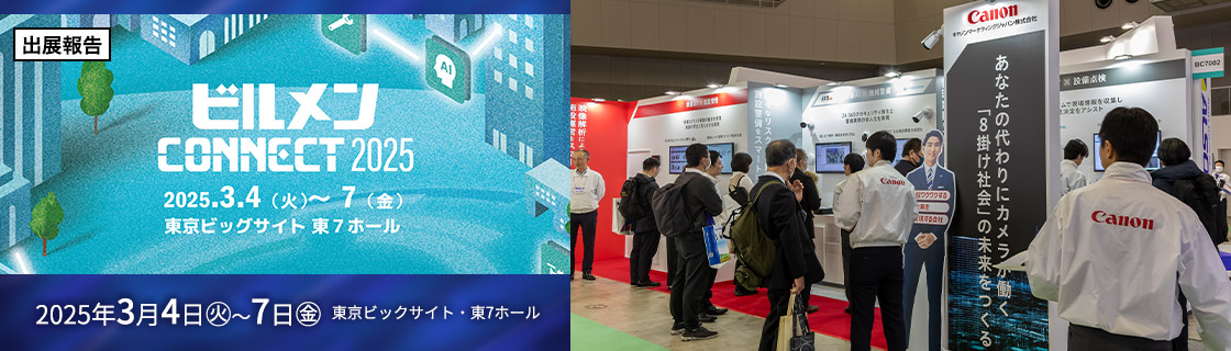 2025年3月に初開催の※「ビルメン CONNECT」は、施設管理の最新ソリューションが集結する大規模イベント。キヤノンマーケティングジャパン(以下、キヤノンMJ)は、「あなたの代わりにカメラが働く『8掛け社会』の未来を創る」をコンセプトに、"映像×AI"活用で警備・設備点検を革新し、業務の効率化と品質向上を両立するソリューションをご提案しました。