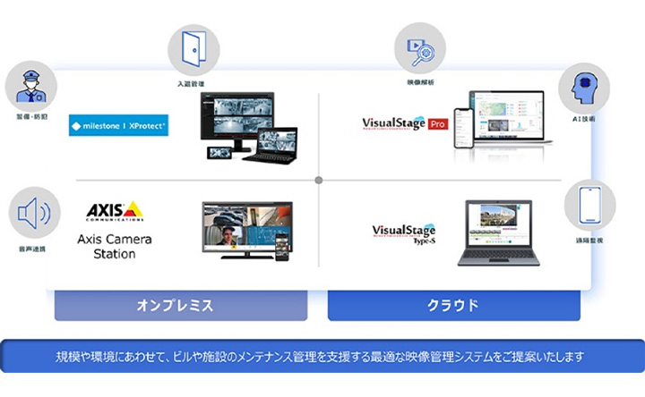 オンプレミス型・ビデオ監視システムMilestone XProtect®とクラウド型・AI映像解析・監視システムVisualStage Pro powered by Arculesのシームレス連携により、高度な施設運営の統合管理を実現します。