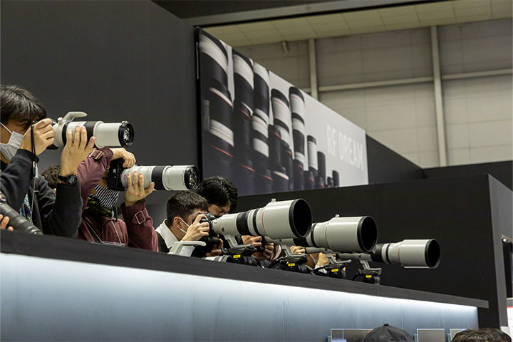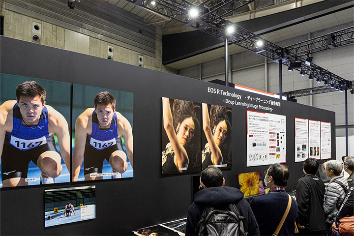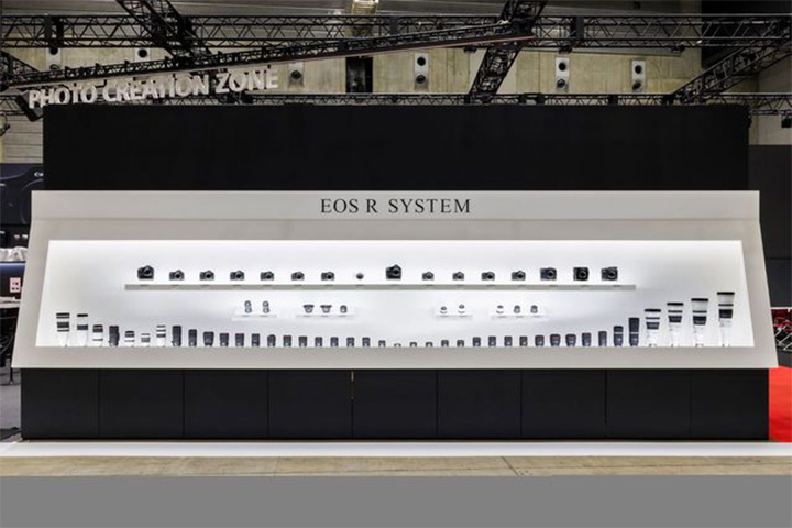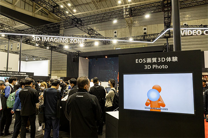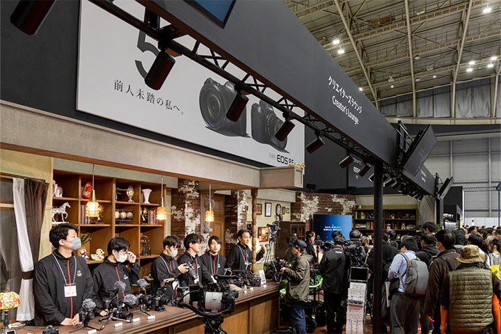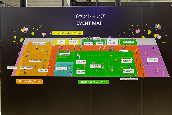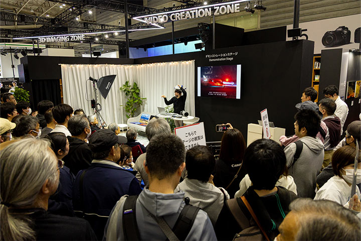出展ブース内は静止画撮影を中心に訴求する「Photo Creation Zone」、動画撮影を紹介する「Video Creation Zone」、そしてEOS VR SYSTEMや先進のMR(複合現実)を体験する「3D Image Zone」と、大きく3つのゾーンに分割。そのほか講演会を行う「プレゼンテーションステージ」「デモンストレーションステージ」を用意し、さまざまな角度から商品やサービスを知っていただける内容としました。