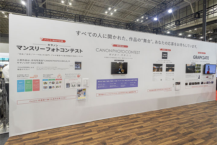 FOCUS ON エリアでは、Canon IDフォトコンテストの受賞作品展示のほか、SNSで集まった作品をミニフォトプリンターSELPHYでプリントして展示しました。また、第一線で活躍する写真家による写真集「PHOTOGRAPHERS' ETERNAL COLLECTION」、キヤノンフォトサークル会員向けの月刊誌も展示しました。
