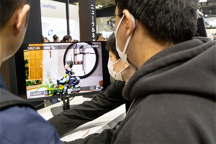 「EOS R テクノロジー」エリアでは、EOS R1とEOS R5 Mark IIに搭載された先進のノイズ処理技術などを紹介。実際にモデル撮影をした後、その場で描写力とノイズ低減効果をご体感していただきました。