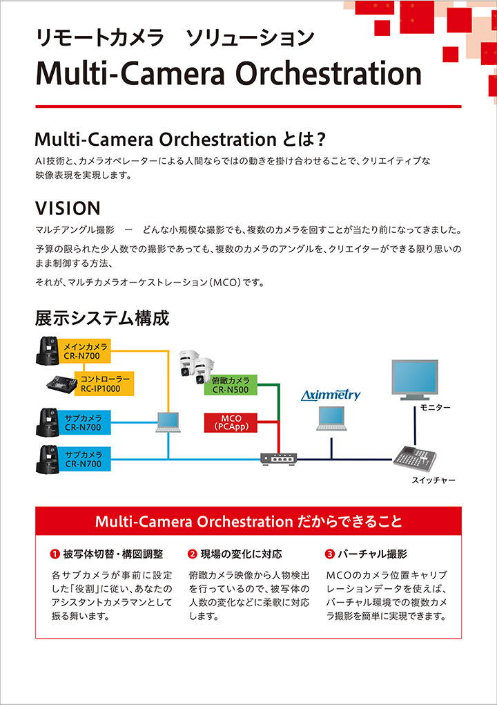 「マルチカメラオーケストレーション」(参考出品)は、従来のマルチカメラ撮影で必要だった全アングルの個別操作を解消し、一人のオペレーターで複数台のカメラのさまざまな画角を活かした映像制作を可能にする革新ソリューションです。「俯瞰カメラ」を目として機能させ、スタジオ全体の状況を把握。俯瞰カメラの情報から撮影用の各PTZカメラ(リモートカメラ)に予め設定された役割に応じて、「今どこを撮影すべきか」を指示することで、有人撮影のようなカメラワークを実現できます。また、カメラ単独の画角外の状況も把握できるため、対象が素早く動いた際に従来の自動追尾で発生しがちだった被写体ロストを防ぎます。少ない人数であってもクオリティと安定感を両立できるため、特に、人員リソースが限られる現場に最適です。
