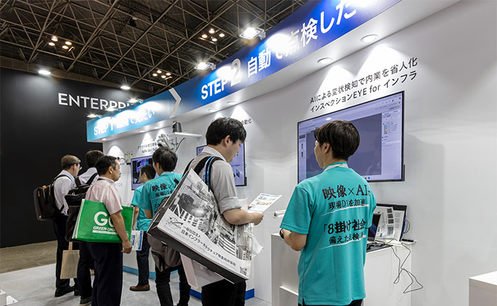 自治体が管理する橋梁の点検で建設コンサルタントが活用するケースが増えており、来場者からは「大量の画像処理には時間もかかるので、画像をアップロードして、検知ボタンを押した後に別の作業を進め、後で結果を確認すれば、時間の節約にもなり、安全性の向上だけでなく、点検業務の効率化と報告書作成の迅速化が図れそう」と高い関心を示されました。