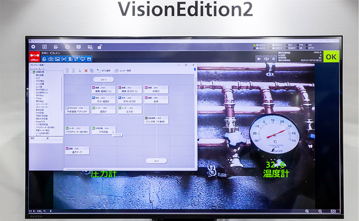 キヤノンMJは、「Vision Edition 2(AI画像解析技術を活用したFA向け画像処理ソフトウェア)」を提供。カメラ映像からアナログメーターや形状、バーコード、数字、文字などを自動で読み取り、リアルタイムにデータ化することで、正確な点検レポートの作成が可能です。また、ネットワークカメラを使えば複数箇所を1台で自動計測。「取得したいもの」「数値化したいもの」は、フローチャート式に選ぶだけで、文字認識などもノーコードでプログラムでき、簡単です。