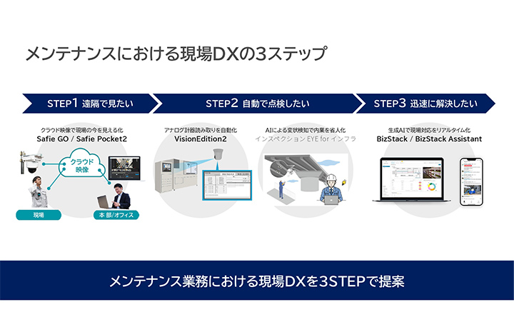 キヤノンMJでは、こうした現場課題に対し、「映像」と「AI」を組み合わせた現場DXソリューションを提供し、大きな注目を集めました。今回の出展では、STEP1 遠隔で見たい→STEP2 自動で点検したい→STEP3 迅速に解決したい という3ステップの実機デモで、実際の保守現場に密着したインフラ点検業務の変革をご紹介しました。
