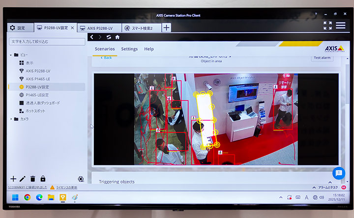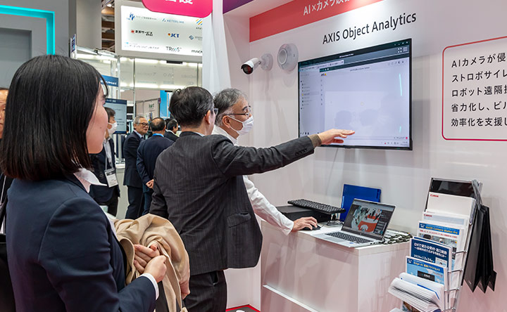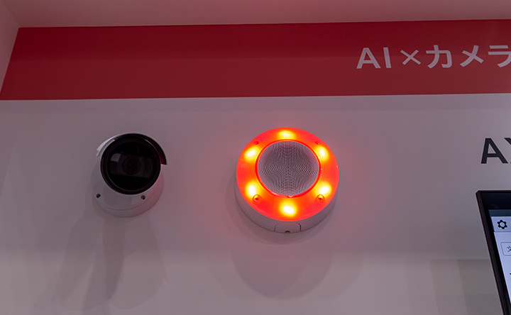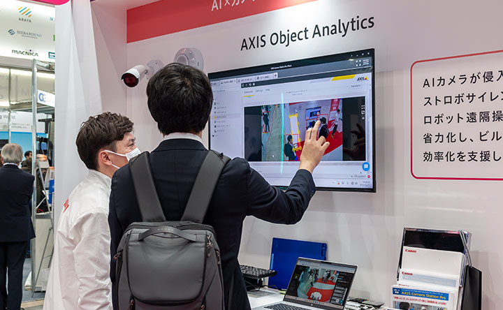 今回の展示では、AXIS社のAIカメラを使った映像解析技術「AXIS Object Analytics」により、あらかじめ設定した進入禁止エリアへの立ち入りを自動判別し、侵入者や誤って立ち入った来訪者を検知すると、ストロボサイレンで自動的に注意喚起を行うデモンストレーションを行いました。これにより、警備員が現場に向かう必要がなく、侵入者への警告と、来訪者の誤侵入抑止が可能となります。