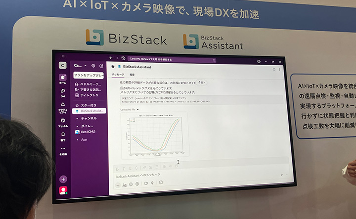 例えば、「排水ポンプに異常が発生した」という通知が来たとします。「BizStack Assistant」に「異常発生時の映像を見せて」と投げかけると、カメラが過去の時刻の映像をすぐに取得します。現場の中央監視室にいなくても、現場の状況をリアルタイムで把握できます。さらに「ポンプのセンサー情報をグラフで見たい」と指示すれば、水温やその他のセンサーデータがグラフ化されて、手元のスマートフォンに表示されます。それらを確認して、もし駆けつけるべきだと判断した場合でも、「BizStack Assistant」に「異常の対処方法を教えて」と尋ねると、過去に蓄積されたQ&Aや手順などのノウハウデータが提示されます。また、マニュアルが格納されたドキュメント管理ツールのURLも教えてもらえるため、必要な事前情報を全て持って現場に駆けつけることができます。将来的には、先ほど、ご紹介した自律走行可能なロボットと連携した現場支援も視野に入れています。
