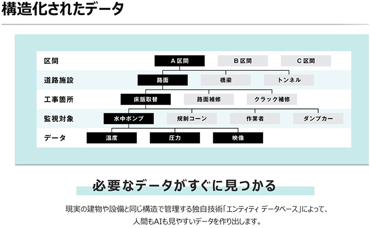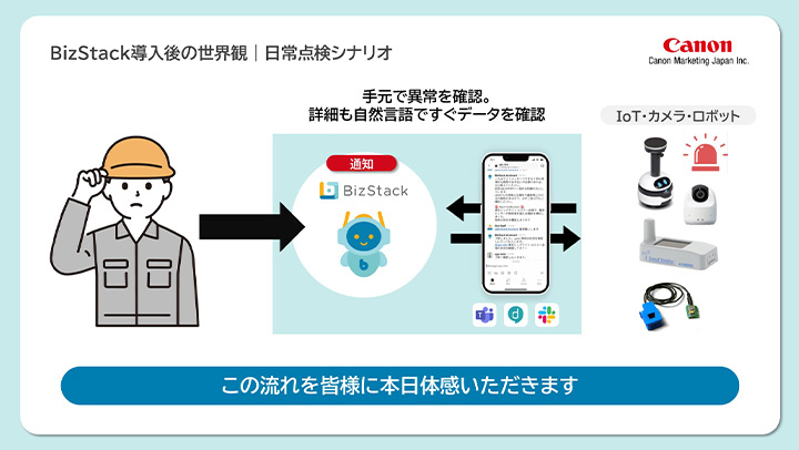 IoTプラットフォーム「BizStack」では、現場で日々膨大に発生するセンサーデータやカメラ映像を統合的に管理・参照することができます。これらのデータを生成AIが横断的に活用することで、現場の状況を最も理解している現業従事者のパートナーとして機能し、判断支援や業務効率化を実現します。
