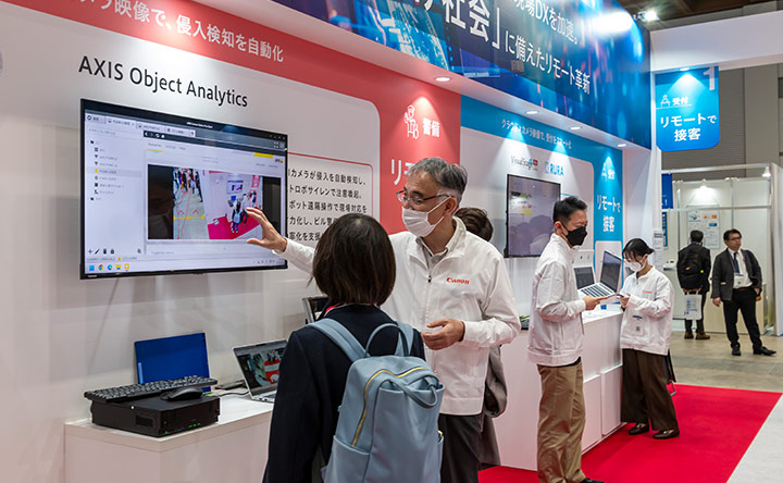 キヤノンMJでは、この課題解決に貢献するため、“人の目”に代わる高度な映像技術を軸に、「映像技術とAI解析、遠隔操作技術を組み合わせた最新のソリューション」を展示し、人手不足に悩む企業に対し、映像DXによる新たな価値を提供いたしました。