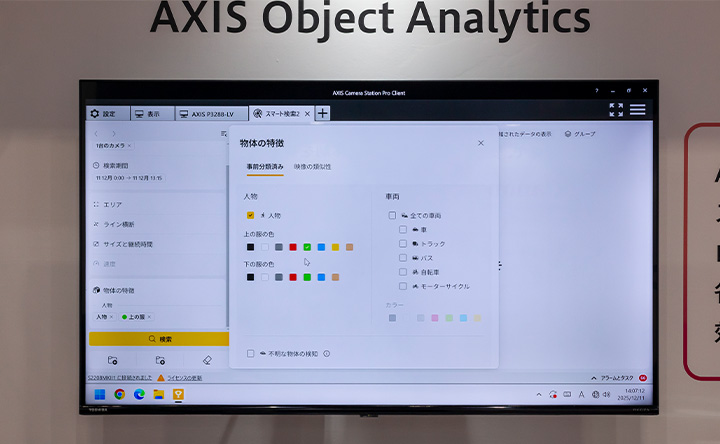 また、映像解析技術の進化により、録画映像から上下の「服の色」などを条件に人物を検索して、不審者の行動追跡・捜索を効率化し、捜査協力や防犯にも貢献できる高度なセキュリティ機能も紹介されました。