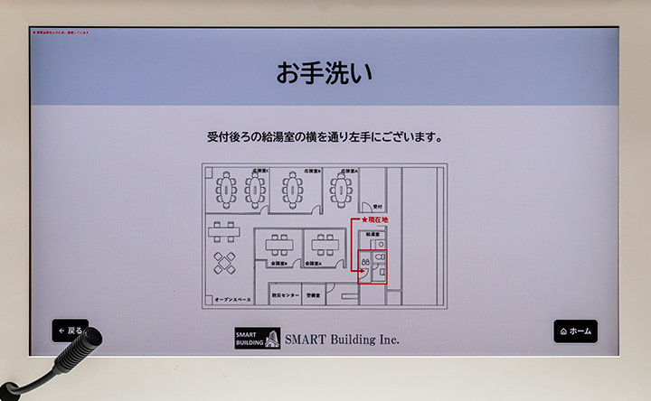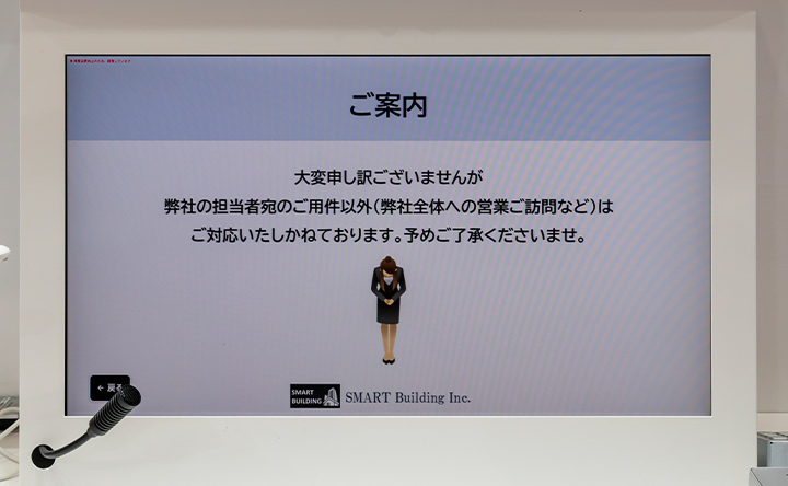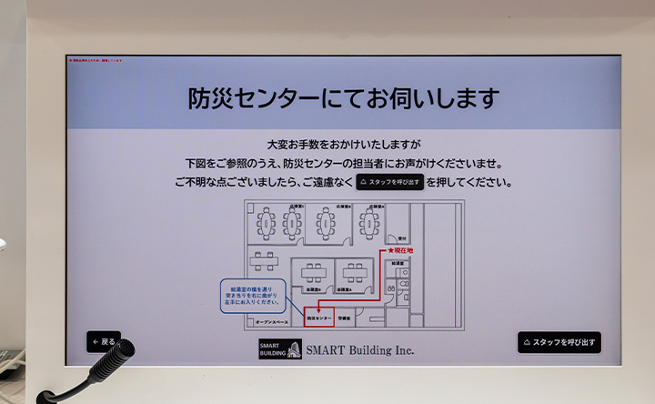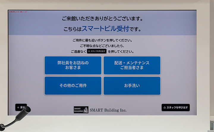 今回の展示で特に注目されたのが、オフィスビル特有の課題解決です。受付業務には、お手洗いの場所案内や配送業者への対応など、必ずしも対面でのご案内や、会話のフォローを伴う必要がない業務が多く含まれています。本ソリューションでは、これらを「セルフ対応」と「遠隔接客」に切り分け、来訪者が画面操作で自己解決できる範囲を拡大。アポイントのある来客など、セキュリティの観点で人による確認や丁寧な対応が必要な場面にのみ遠隔スタッフが画面越しに応対します。