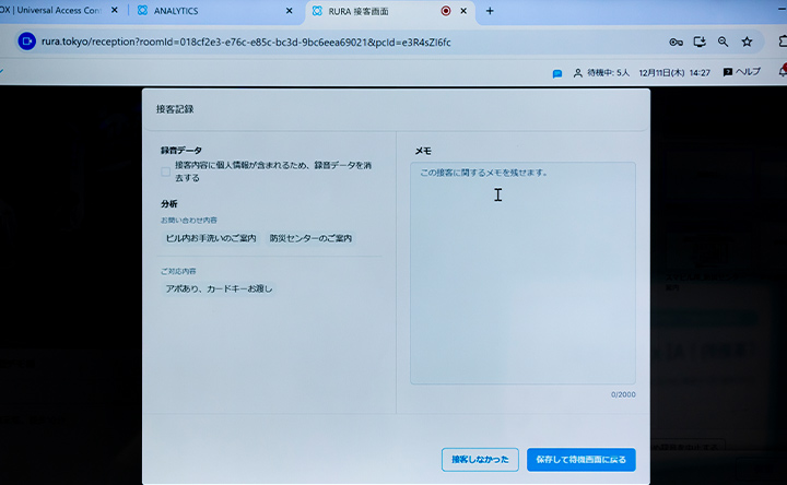 さらに、本人確認から入館証(カードキー)等の貸与までを、その場に人がいなくても完結させる仕組みも披露しました。カメラ越しに来訪者の身分証や名刺を確認し、遠隔操作でカードキーを格納した鍵ボックスを開錠することで、遠隔からでも安全な貸与を実現。また、メモ機能を利用して来客記録を残すことで、紙の台帳記入も不要になります。自社ビルでの実証実験を経て磨き上げられたこのシステムは、受付業務の強力な省人化対策として、導入の加速が期待されています。